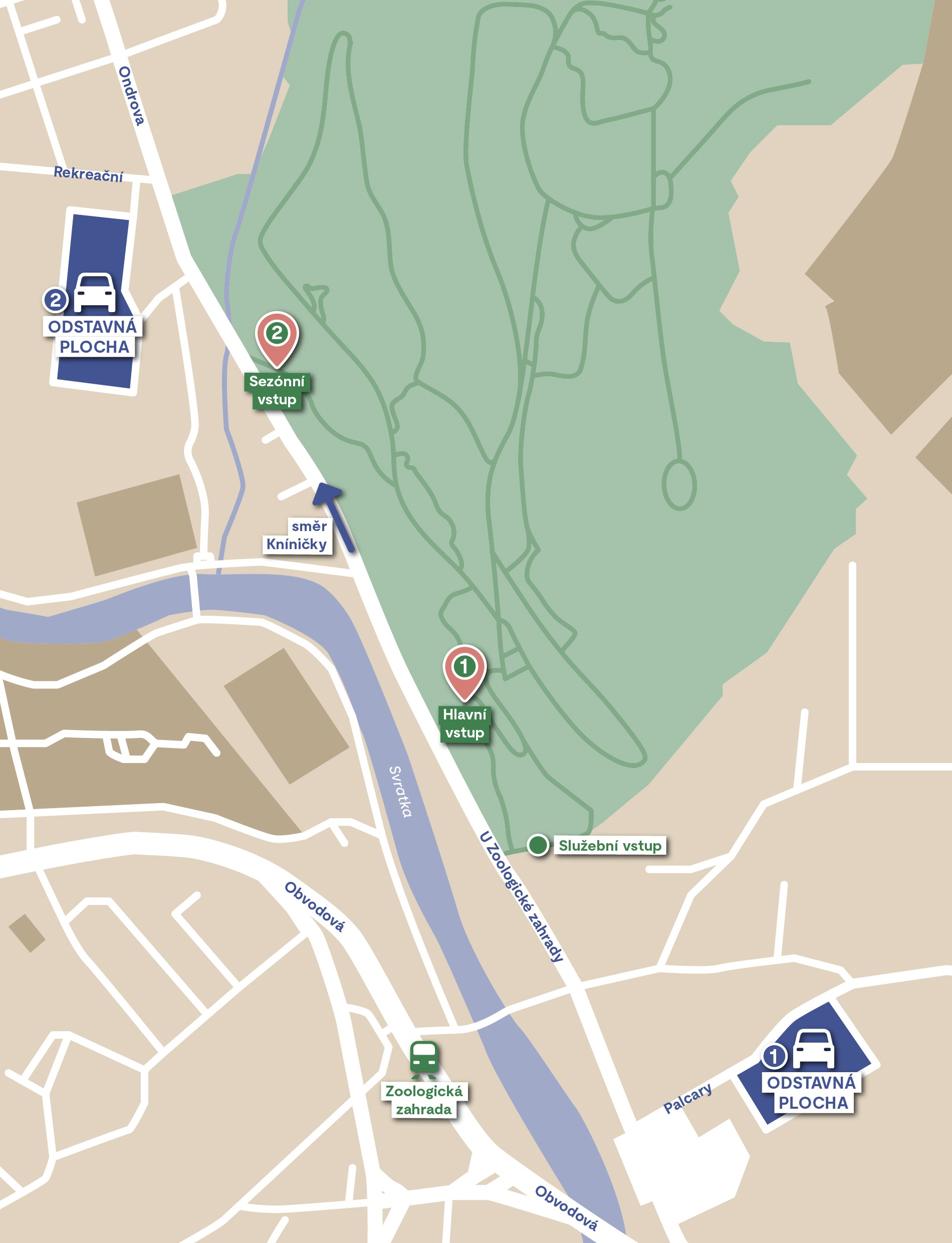 Pokud k nám míříte autem, pomůže vám přehledná mapa odstavných ploch a přístupů k zoo, kterou najdete níže.
